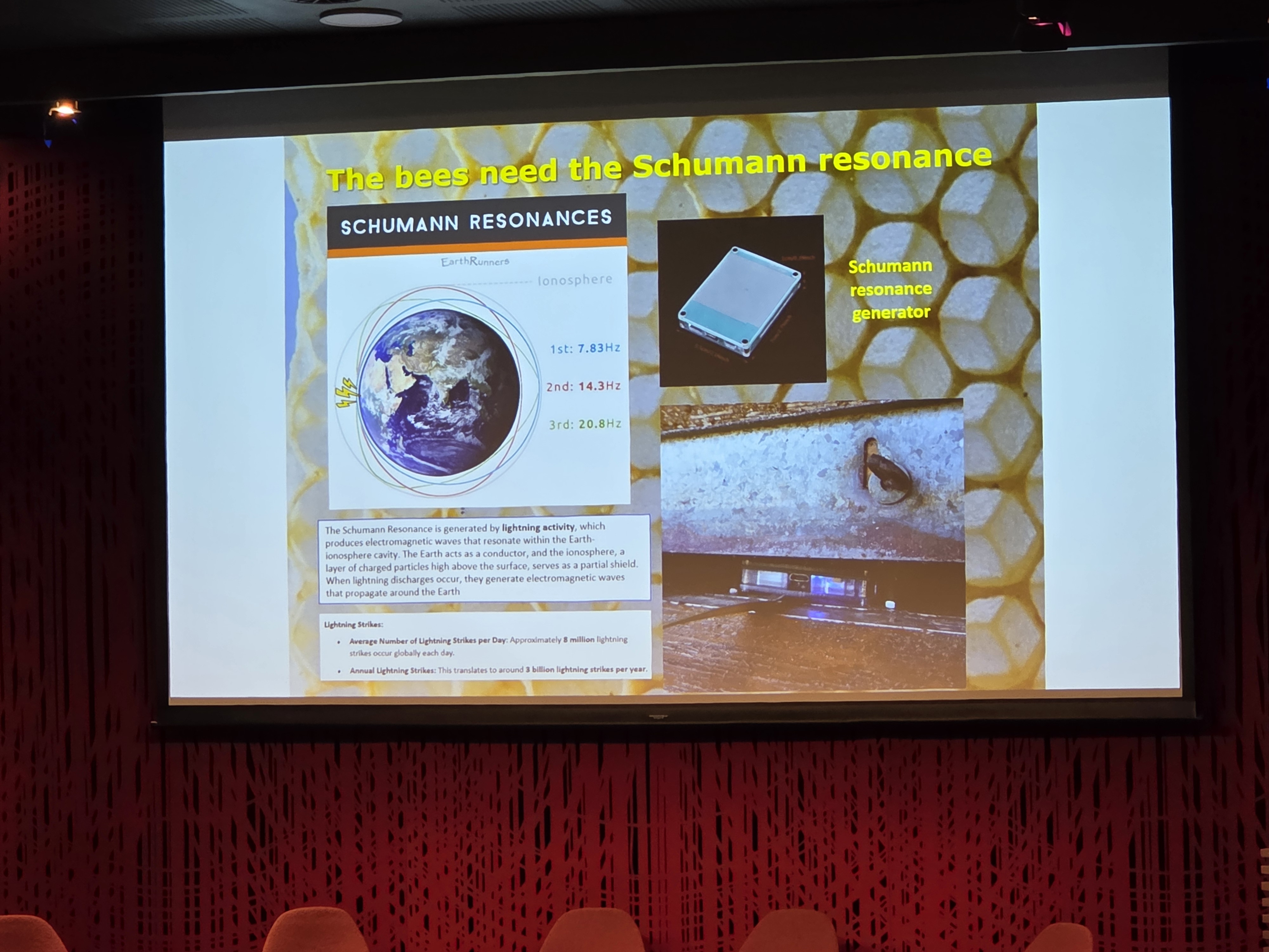 I sin presentasjon var han veldig klar i sin tro på hva som var gått tapt. Han sa at han hadde funnet bevis for at det var Schumann-resonansen. Hvorfor det? Fordi da han introduserte frekvensene til Schumann-resonansene i den EMF-skjermede bikuben ved hjelp av en Schumann-generator, reverserte det de negative effektene som tidligere var observert i den EMF-skjermede bikuben.