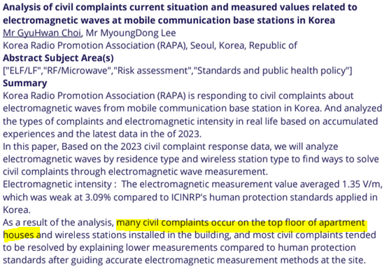 I tillegg til Okinawa-studien, er jeg kjent med et bidrag fra BioEM 2024, verdens største vitenskapelige konferanse for forskning på elektromagnetiske felt og helse, hvor sør-koreanske myndigheter presenterte noen analyser av befolkningens klager om stråling og strålekilder. Klager kom ofte fra beboere på øverste etasjenivå. Her er deres sammendrag fra konferansen: