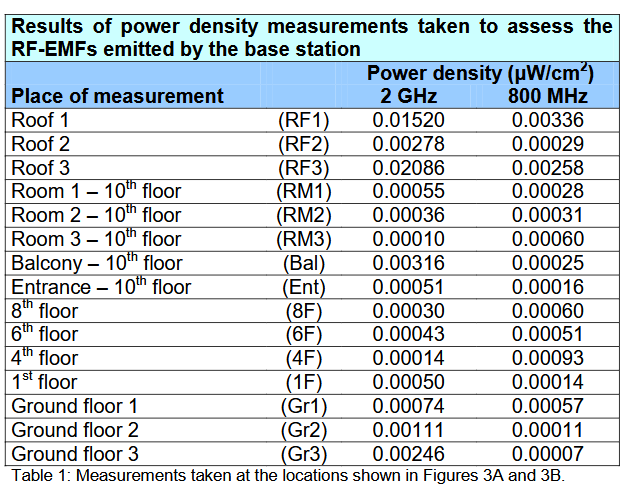 Jeg er bare kjent med én rapport som faktisk har målt eksponering for radiofrekvent stråling på tvers av ulike etasjenivåer. Målinger ble utført i en japansk studie fra Okinawa (Shinjyo and Shinjyo 2014), før de fjernet antenner montert på taket av en leilighetsbygning. Målingene vises nedenfor.